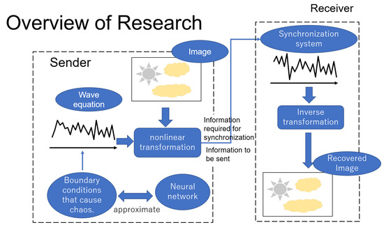 Firstly, the proposed approach employs the chaotic wave equation, which is an evolutional partial differential equation and hence has two axes (space and time). This feature of the equation enables the method to transmit images. Secondly, the proposed secret communication system consists of two parts, the sender and the receiver, as shown in Figure 1. First, the wave equation on the sender side is under the van der Pol boundary conditions that can cause chaotic phenomena, and a deep neural network is trained so that it has the same chaotic effect. Then, the color images are encrypted by applying a certain nonlinear transformation together with the solutions to the wave equations. The nonlinear transformation is designed so that the inverse of it is computable if the solutions to the wave equations, which are essentially the secret keys, are known. Second, a chaotic synchronization system is established at the receiver side to obtain the decrypted recovered images by inverting the function.