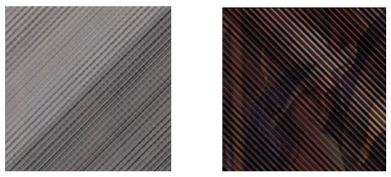 Meanwhile, the histogram of the encrypted image in the mode of the proposed method presents an unbalanced state with a high concentration in a certain region. The reason for this phenomenon is as follows. The proposal method uses the reflection of waves, and even though the initial conditions are random values, they are propagated to the left and right sides along straight lines. In fact, as shown in Figure 23, the images encrypted by AES and the images encrypted by the proposed method are apparently different from each other. The former has almost no structure, and the latter a visible structure that corresponds to the trajectories of the waves. The above mentioned concentration is observed because the intensity of a trajectory takes the same value.