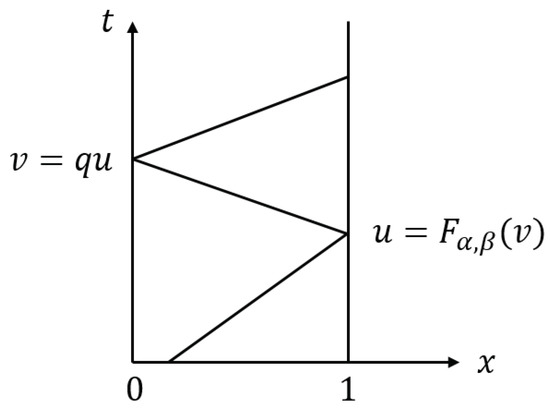 Reflection of the characteristic lines. The waves are reflected at and , where the two functions and are applied.