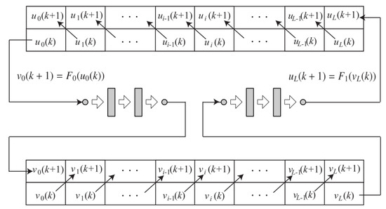 Divide the interval equally into L parts and set the division points . Here, the interval is given by . The time step size is set to and we write . For the system (16) denote the states, denote the approximation values of on the grid points . For simplicity, we introduce the dimension vectors , . Denote , for system (18) as well, and denote the dimension vector , , . Thus, for example, in Figure 4, the signals sent from to for synchronization are discretized to , respectively. The time evolution of the vector is shown in Figure 5. We approximate the and by the upwind difference using the same step sizes in the spatial and temporal directions so that the CFL number is 1. As a result, we obtain an algorithm where is transported to and is to . More precisely, the system after discretization is