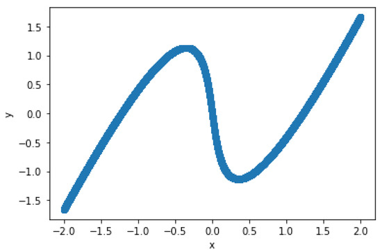 was solved using the Newton method, with the target y of the neural network being the solution to the equation. The number of data was set to 20,000. The scatter plot of x and the solutions y for the equation are shown in Figure 9. To reduce the bias of the input data for training, we split the dataset randomly using the train test split function of the Python library Scikit-learn to select the training data and the test data. Here, we use 20% of all data as a test set, so the number of data in the training set is 16,000 and the number of test sets is 4000. The neural network was implemented using PyTorch, and it was executed on a Tesla K80 on Google Colaboratory.