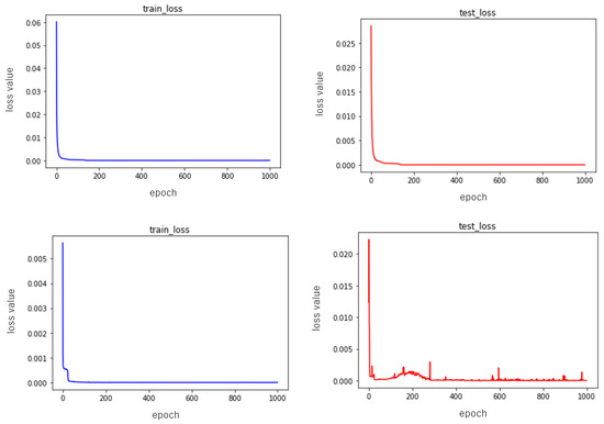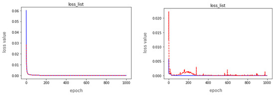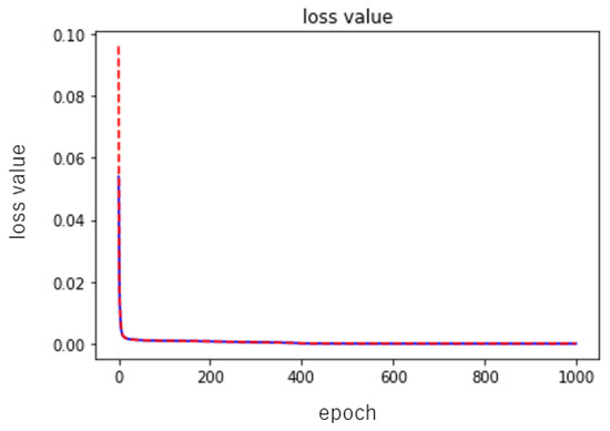 Table 3 shows the numerical evaluation of the training results and the test results of the neural network. A total of ten experiments were conducted, and each time the seed value was changed so that the initial values of the parameters of the neural networks are changed. The mean and standard deviation are computed for the experimental results. We can see that the results of training and testing are 0.000694 ± 0.000035 and 0.000919 ± 0.000033, respectively, and Figure 17 shows the error decrease of one of the trainings, from which we can clearly see that the training error and the testing error both decrease rapidly, and there is almost no error rebound. Then, we calculated the Lyapunov exponent, respectively, and , where and are positive, so we can conclude that the neural networks are in fact chaotic, which somehow approximates the van der Pol boundary condition.