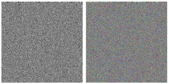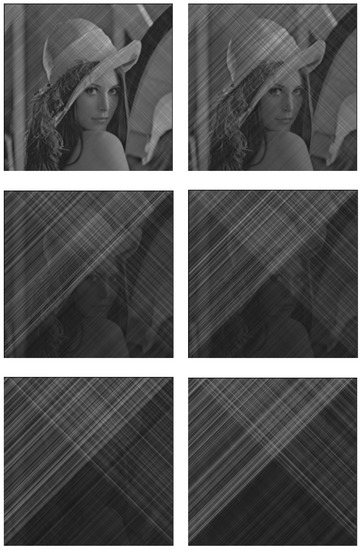 From the results of the grayscale and color images shown in Table 7 and Table 8, it can be seen that the correlation coefficients between the encrypted images of different images are significantly large. The values are indeed almost close to one; when ten decimal places are used, the values of correlation coefficients are, for example, 0.9999999977 for the grayscale image of “boat” with and that of “lena” with and 0.9999999865 for the color image of “boat” with and that of “lena” with . The other two measures are very small in all cases, indicating high indistinguishability between the encrypted images, hence the high security of the proposed approach.