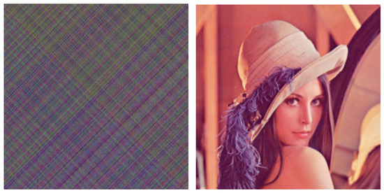 Firstly, we computed the correlation coefficients between adjacent pixels for the encrypted image in three different directions: horizontal, vertical and diagonal. Suppose that the image has pixels . We calculate the correlation coefficients for R, G and B values, respectively: