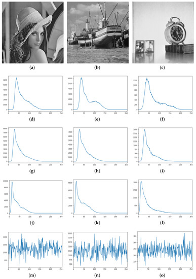 The grayscale images and the histograms of the encrypted images. The first row shows three different grayscale images (a–c). In the second, third and fourth rows, the three figures in each row represent the histograms of the grayscale values of the three original images encrypted by the proposed approach under the settings of and , respectively (d–l). The last row shows the histogram after encryption by the AES. The horizontal coordinate represents the tonal range and the vertical coordinate represents the absolute frequency (m–o).