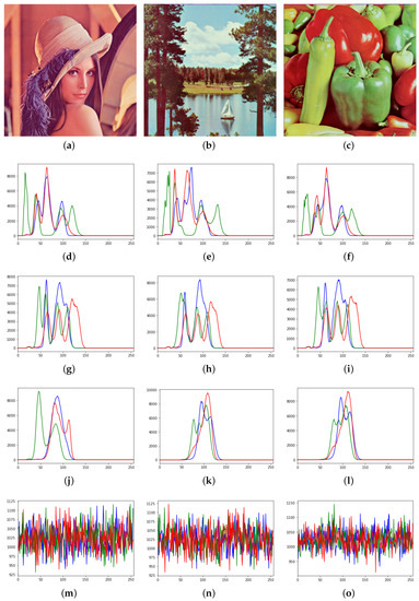 The color images and the histogram of the encrypted image. The first row shows three different color images (a–c). In the second, third and fourth rows, the three figures in each row represent the histograms of the three original images encrypted by the proposed approach under the settings of and , respectively. The last row shows the histogram after encryption by the AES. The red, green and blue colors correspond to the histograms of each channel of R, G and B, respectively (d–l). The last row shows the histograms after encryption by the AES. The horizontal coordinates represent the tonal range and the vertical coordinates represent the absolute frequency (m–o).