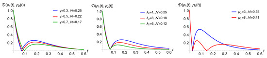 All revivals depicted until now are started when the trace distance assumes value zero, i.e., when at the associated time, the evolved states are the same. This can be seen as a special realization of non-Markovian behaviour since in this case, the dynamical map is neither invertible nor divisible. This is, however, not always the case. We observe that a revival occurs for larger values of the trace distance when the condition (3-WTDs process) is satisfied; see Figure 6, left, where the is varied, and right, where is altered. The mean waiting time of the second jump is small enough with respect to the first jump to prevent the trace distance to reach zero, and the following third jumps occur too late to change this tendency. Note that, in this case, the maximal number of revivals, , cannot be reached.