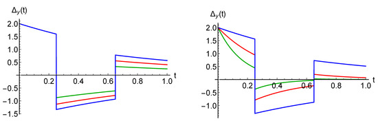 As already elaborated, in the considered case, the time continuous dynamics between the jumps does not strongly affect the qualitative picture of non-Markovianity. It is, therefore, of interest to consider the effect of jumps and modified waiting time distributions alone, setting ; see Equation (12). In this case, the density operator follows the following evolution: