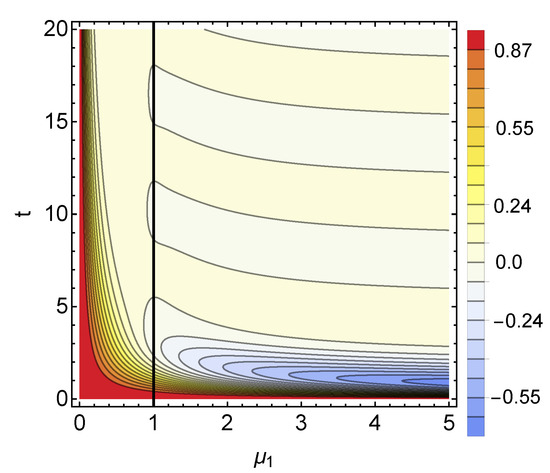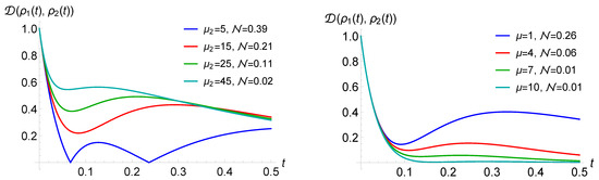 Choosing a unital dynamical map does not affect the trace distance measure of non-Markovianity, which is insensitive to translations [42,58,85]. As the time-continuous evolution introduced above describes a monotonic contraction of the Bloch sphere, we do not expect that it introduces any memory effects. Indeed, the dynamical map is not only Markovian, according to the distinguishability criterion introduced in [47], but it is a CP-divisible semigroup. We see that a greater “strength” of this dephasing evolution—corresponding to larger values of the ’s introduced in Equation (24)—results in smaller non-Markovianity of the associated quantum renewal process.
