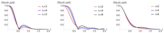 Considering WTDs that can lead to non-Markovianity for unmodified processes, the maximal possible number of revivals can become larger. This can be observed by taking into account an Erlang distribution, whose WTD is given by Equation (28), governing the randomness of the jump times, while here, we focus on numerical results; see Section 5.4 for analytical findings. For Erlang distributions with fixed mean value, the higher the shape parameter r or the larger the rate , the narrower the distribution. Accordingly, with growing r or , the revivals of the trace distance can be seen to be more and more like independent phenomena. In this case, the jumps do not “destructively interfere” with each other, and the time intervals of the jumps are almost disjointed. This explains the increase in the non-Markovianity measure with higher shape parameter r or larger rate , as one can see in the simulations in Figure 7, left. This slightly influences also the time of the revivals, and the higher the shape parameter, the closer this time is to the mean value of the first WTD.