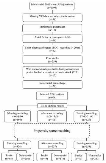 Data pertaining to clinical characteristics and 24-h electrocardiogram (ECG) of 1093 patients with AFib were recorded from January 2005 to December 2013 at the Fujita Health University Hospital, Aichi, Japan. We excluded patients with certain criteria, such as (1) those with missing HRV data and missing or incorrect subject information; (2) those with a pacemaker; (3) those with atrial flutter or paroxysmal AFib; (4) those whose length of ECG recording was shorter than 20 h; (5) those who had a prior stroke; (6) those who did not develop an ischemic stroke during the observation period, but had a transient ischemic attack (TIA); and (7) those who had an intracranial hemorrhage. The remaining patients were then separated into two groups: (1) the ischemic stroke and (2) the non-ischemic stroke groups, which comprised patients who developed and did not develop an ischemic stroke during the follow-up years, respectively. Thereafter, the selected 628 stroke-naïve AFib patients were grouped based on their availability of morning (04:00 a.m.–08:00 a.m.), afternoon (11:00 a.m.–15:00 p.m.), and evening (17:00 p.m.–21:00 p.m.) recordings. A flowchart of patient selection is presented in Figure 1. We did not analyze the data during midnight hours, as sleep disorders (such as obstructive sleep apnea syndrome) might affect the sample entropy result [14]. To reduce the effect of confounding factors, we applied propensity score matching to the remaining patients with covariates as follows: age; body mass index (BMI); sex; inpatient/outpatient department; underlying diseases such as hypertension, coronary artery disease, heart failure, diabetes, dilated cardiomyopathy, and hypertrophic cardiomyopathy; and treatment with digitalis and warfarin. Propensity score matching was performed by matching one-on-four without replacement and a caliper of 0.2 of the standard deviation of the logit of the propensity score. In this study, the HRV time series is referred to as ventricular response interval (VRI) in AFib patients. VRI recordings were extracted automatically from the 24-h Holter electrocardiograms (ECGs) (Nihon Kohden, Tokyo, Japan), then interpolated linearly and resampled at 4 Hz. This research was approved by the ethics committee of Fujita Health University (approval No. HM17-232) for data measurement and Kwansei Gakuin University ethics committee (approval No. KG-IRB-18-02) for data analysis, and conformed to the principles outlined in the Declaration of Helsinki. For the use of data, the opt-out recruitment was approved by the Fujita Health University.