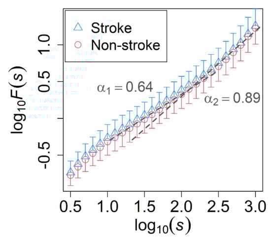 Fluctuation functions F(s) estimated by the detrended fluctuation analysis (DFA) of the morning recording. Comparison between stroke-naïve AFib patients who developed (blue triangle) and did not develop (red circle) an ischemic stroke during the observation period. The unit of s is seconds. Error bars represent the standard deviation, while dashed lines indicate the slopes with = 0.64 and = 0.89. No significant difference was found in the scaling exponents of DFA between the two groups.