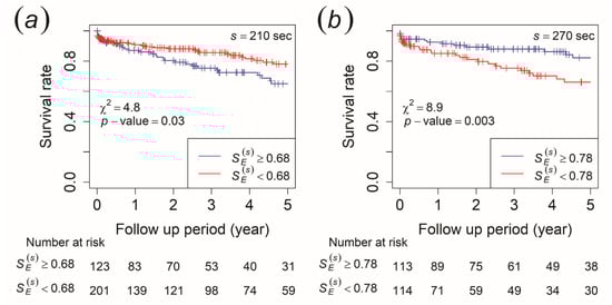 As MSE profiles provide a possible characterization of the biosignal complexity [38], factors such as time correlation and probability distribution characteristics affect the results of . Therefore, we applied both survival analyses to verify the factors contributing to the difference in in our study. The time correlation characteristic was calculated by autocorrelation coefficient at lag τ = 1 (), while the probability distribution characteristic was calculated by information entropy (). As a result, we confirmed that had a negative correlation with in the morning and afternoon recording. For the morning recording, patients with < 0.88 at the time scale of 210 s had a higher risk of developing an ischemic stroke (Figure 5a). For the afternoon recording, those with ≥ 0.82 at the time scale of 240 s and ≥ 0.81 at the time scale of 270 s had a higher risk of developing an ischemic stroke (the result for 270 s is shown in Figure 5b). On the contrary, we found that had a negative correlation with the result of for the morning recording. The results showed that patients with < 2.18 at the time scale of 210 s had a higher risk of developing ischemic stroke (Figure 6a). Unlike the time correlation characteristic, was assumed to have a positive correlation. Thus, our result implied that only the time correlation characteristic might contribute to the difference in , because had an adverse effect on .