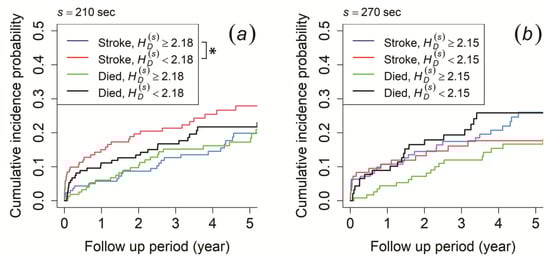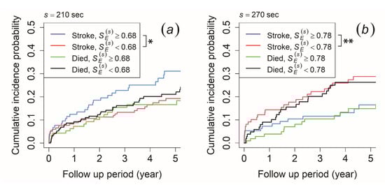 Cumulative incidence function for ischemic stroke occurrence and mortality. The patients were stratified by (a) information entropy () ≥ 2.18 (blue and green line) and < 2.18 (red and black line) at a time scale of 210 s of the morning recording and (b) ≥ 2.15 (blue and green line) and < 2.15 (red and black line) at a time scale of 270 s of the afternoon recording. An asterisk (*) indicates p-value < 0.05.