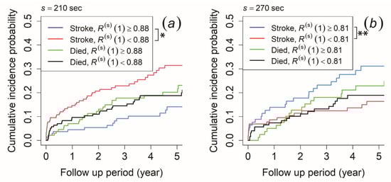 Cumulative incidence function for ischemic stroke occurrence and mortality. The patients were stratified by (a) ≥ 0.68 (blue and green line) and < 0.68 (red and black line) at a time scale of 210 s of the morning recording and (b) ≥ 0.78 (blue and green line) and < 0.78 (red and black line) at a time scale of 270 s of the afternoon recording. An asterisk (*) indicates p-value < 0.05, while double asterisks (**) indicates p-value < 0.01.
