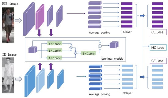 At present, the methods of RGB image person re-identification have achieved remarkable performance. The deep neural networks, which have made great progress for single-modality person re-identification, have also boosted cross-modality person re-identification. However, this new task still faces the problem of intra-class modality difference, as shown in Figure 1. Therefore, cross-modality research not only focuses on improving the feature extraction ability of the deep network but also considers how to design appropriate loss functions to improve the feature similarity value of the same pedestrian in the different modalities. Zhu et al. [23] uses heterogeneous loss function to improve the similarity of the same person under different modalities and achieves superior performance. However, they do not consider the contribution of global features to each location. To further improve the network’s contribution to cross-modality person Re-ID, inspired by [23,25,28], we propose to improve the feature expression ability and intra-class cross-modality similarity from two aspects, namely improving the structure of a deep network and designing a loss function. In the following description, we design a dual-channel deep neural network framework that combines a heterogeneous center loss function and non-local module. The main contribution of this documentation is based on a two-way network (RGB branch and IR branch) in order to extract the features of visible-light images and IR images separately. We propose improving the contribution of global features to each location. Specifically, inspired by [25,28], we propose to add a non-local attention module to the RGB branch and IR branch to improve the contribution of global features to each local location. The structure of the two network channels is the same, but the parameters are not shared, and the network structure has scalability. To improve the feature similarity of intra-class cross-modality images, inspired by HC loss [23], the heterogeneous center loss function is used to shorten the distance between different modality feature centers in the class. Therefore, this paper combines cross-entropy loss (CE loss) and the heterogeneous center loss (HC loss) function to supervise training jointly. Beyond this, because different parts of a human body have their inherent properties, the idea of the block is introduced into the network to obtain the characteristic expression of discriminating force between different modalities. The performance of the proposed method on the SYSU-MM01 [26] dataset demonstrates the effectiveness.