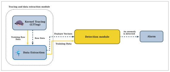 As illustrated in Figure 2, the entire framework is divided into several modules. First, kernel tracing is done to gather the system calls information during the execution of a program. We employ LTTng (Linux Trace Toolkit Next Generation) in this module, a system software package for correlated tracing of the Linux kernel, applications, and libraries. The raw tracing data is fed into the data extraction module that processes it with a windowing method that will be introduced later in this paper. Data transformation and feature extraction is done in the Trace Compass application. This module is responsible for preparing data for the detection module in both the training and detection phases. This data contains feature vectors extracted from the tracing data. When the model is trained, the data extraction module sends new feature vectors to the detection module at detection time. We discuss each module in the following sections.