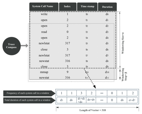 First, the processes other than the one under study (e.g., MySQL and Chrome) are filtered out considering the process ID field. Then, instead of working with system call names, an index is assigned to each system call. The system calls indices, the corresponding execution times, and other related information are listed for all threads of the target process. Since a single process can produce a huge amount of system calls, considering all system calls at once is not practical in real applications. Therefore, a sliding window is used to continuously extract data from subsequences of system calls. For each subsequence, we define a compact representation that yields two separate feature vectors containing the frequency () and the duration () of the system calls inside the current sliding window. Thus, our methodology can handle large and varying volumes of data. Since we monitor 318 different system calls of the Linux operating system, each feature vector has 318 dimensions, one per system call type. This feature extraction strategy is shown in Figure 4.