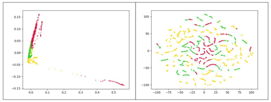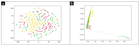Frequency-based samples extracted from Chrome process. Red, yellow and green points refer to normal, CPU problems, and memory problems, respectively. (a) uses t-SNE and (b) utilizes PCA to map data points onto 2D subspaces.