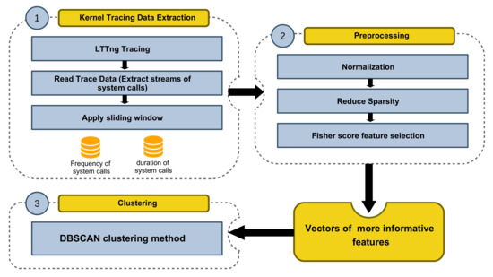 Figure 6 summarizes the proposed anomaly detection technique. The kernel tracing data extraction module, which utilized LTTng, Trace Compass, and our windowing method, has the duty of generating vectors. Then in the preprocessing module, some refinements on data are done, and the vectors of more informative features are obtained. Finally, DBSCAN clustering is applied to the obtained dataset.