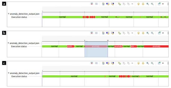 Similar to the data collection phase, the trace file is read by our script in Trace Compass. Then, the whole set of system calls are formatted into windows, which are in turn analyzed by the detection module which highlights the anomalous ones. Our proposed anomaly detection framework represents the output of the detection module in a Trace Compass time chart view. Figure 7a,c demonstrate the effectiveness of our proposed method in locating the attacks that have been simulated by Stress and zip bombs. In these time charts, the normal and anomalous windows are illustrated in green and red colors, respectively. The proposed framework helps system experts to focus at just a few small windows instead of the whole trace that may include millions of events. The resulting time charts can be zoomed in and zoomed out in specific areas (Figure 7b).