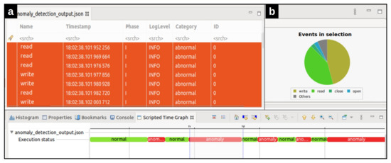 More detailed data can be computed from the trace as the user zooms in using the mouse wheel or right-clicking and dragging in the time scale. The time axis in the time chart is aligned with other views that support automatic time axis alignment. The other capability of our framework is its events editor view (Figure 8a), which presents the events in a tabular format. Filtering or searching of events in the table can be done by entering matching conditions in one or multiple columns in the header row. As can be seen in Figure 8, in addition to the original events fields, a new field has been added to each event. The field category determines whether the event belonged to a normal or abnormal window. Finally, the statistics view (Figure 8b) is provided to display the various event counters. Time synchronization is enabled between the time chart view, events editor, and statistics view. When a filter is applied in the events table, the non-matching ticks are removed from the Time Chart view (and vice versa) [25]. Moreover, the currently selected time range’s event type distribution is shown by selecting a time range in the time chart. Figure 8b shows the statistics view of the selected anomalous area detected by our tool. The distribution of events in the selected area led us to identify that the attack created by the zip bombs caused the system not to respond to Mysql requests appropriately during this period. The implementation of this visualization module which can be run using the scripting plugin in Trace Compass, is available on Github https://github.com/kohyar/syscall_anomaly_tracecompass_visualization.git (accessed on 28 July 2021).