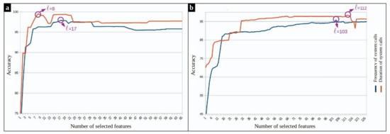 To tune the hyperparameters of our supervised model, 10-fold cross-validation strategy is used. One fold is used as validation and the union of other folds as training data. This process is repeated ten times for an unbiased evaluation. Fisher scores of the system calls are calculated in each run over the training set. As expected, results show that in both frequency and duration based feature spaces, some system calls have high Fisher scores, and therefore, play a more important role in separating the classes. Figure 9 shows the accuracy of the supervised anomaly detection approach during 10-fold cross-validation by varying the number ℓ of selected features. The experiment on MySQL processes reveals that and should be selected for the frequency and duration feature space, respectively. The same experiment on Chrome processes shows that the best number of features is regarding frequency-based features and regarding the duration-based features.