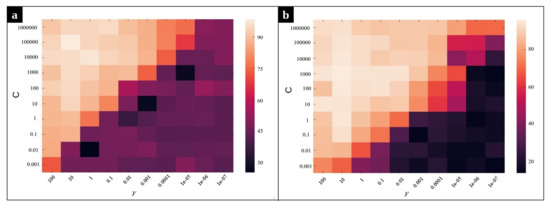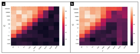 Heat map of the frequency-based and duration-based supervised anomaly detection accuracy using different parameters and C for Chrome dataset. (a) The heat map for frequency feature space, (b) The heat map for duration feature space.