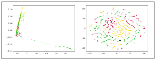 The visual result of K-Means clustering after choosing features with the highest fisher score on frequency-based data set for the Chrome process; each color refers to a cluster. The left plot uses PCA, and the right plot utilizes t-SNE to map data points onto 2D subspaces.