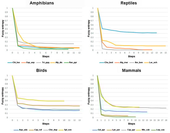 Graphs showing fuzzy entropy at each of the steps of the stepwise procedure for all analysed species, separated according to taxonomic group. Exact values are given in Supplementary Materials S1. Species codes as in Table 1.