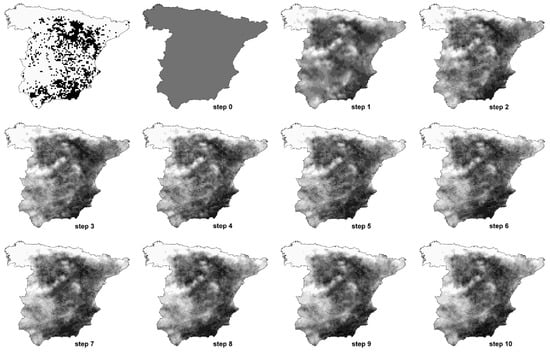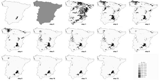 As examples, in Table 2 and Table 3, we show the entropy of each step of the models of two species, Algyroides marchi and Sylvia conspicillata. The entropy of each of the steps for all the species can be seen in Supplementary Materials S1. In Figure 2 and Figure 3, we represent the favourability values of each step of the models for both example species. The fuzzy entropy of step 0 is equal for all the species, and it is always equal to the unity. In step 0, the only parameter to form part of the model is the intercept, which means that the probability of presence in all the cells is equal to the prevalence of the species. Therefore, the favourability in all the cells in step 0 is equal to 0.5, whichever the prevalence of the species.
