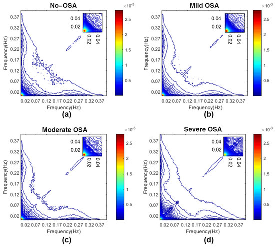 Averaged bispectrum magnitude in the range 0–0.4 Hz in the training set for the four severity groups. To improve the visualization of the coupling focus at very low frequencies, an amplification between 0 and 0.05 Hz is depicted in the upper right corner for each figure. (a) No-OSA; (b) mild OSA; (c) moderate OSA; (d) severe OSA.