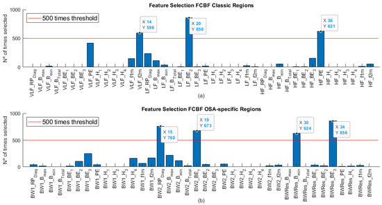 Features selected in each feature set after applying FCBF algorithm over 1000 bootstrap replicates of the training set. (a) Features selected in the classic region set; (b) features selected in the OSA-specific region set.