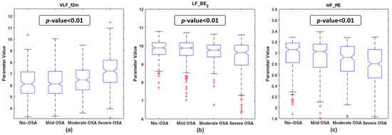 Boxplot distribution of the features selected in the bispectral classic region feature subset for the four OSA severity groups in the training set. The p-value obtained with the Kruskal–Wallis test is shown in each subplot. (a) VLF_f2m boxplots and p-value; (b) LF_BE2 boxplots and p-value; (c) HF_PE boxplots and p-value.