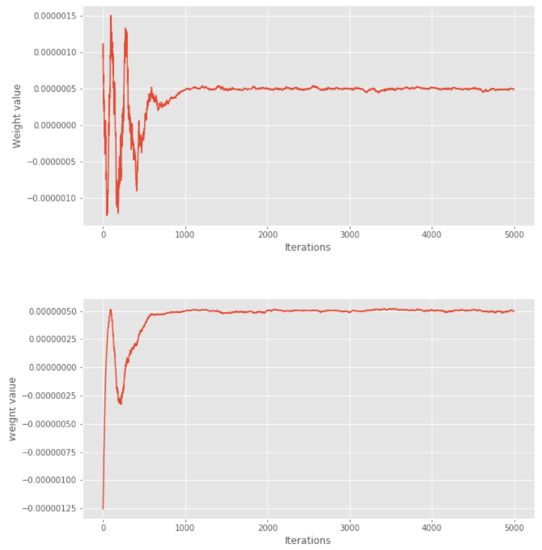 We compress this chain into a subsample of size either or . For each value of M, we run different variations of our cube method 50 times and make a comparison with the usual thinning method and with the KSD thinning method with different kernels, see [5]. In Figure 1, we show the first 5000 weights of the cube method. We can see that after 1000 iterations, the weights seem to stabilise. Based on visual examination of these weights, we chose a conservative burn-in period of 2000 iterations for the variants where burn-in is removed manually.