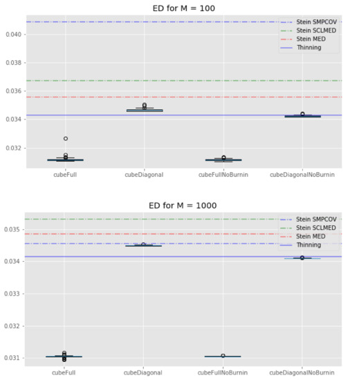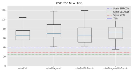 The picture is different for : KSD thinning outperforms standard thinning, which in turn outperforms all of our cube thinning variations. Once again, the fact that the KSD method performs better than any other method seems reasonable: since it regards minimizing the Kernel–Stein Discrepancy, the KSD method is “playing at home” on this metric.