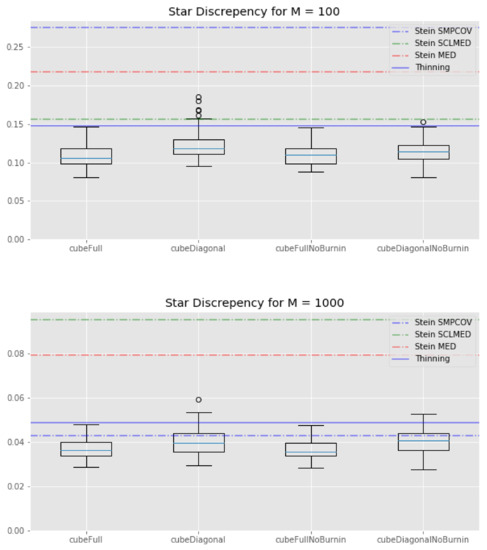 In the following (in particular in the plots), “cubeFull” (resp. “cubeDiagonal”) will refer to our approach based on the full (resp. diagonal) set of control variates, as discussed in Section 2.3. “NoBurnin” means that burn-in has been discarded manually (hence, no burn-in in the inputs). Finally, “thinning” denotes the usual thinning approach, “SMPCOV”, “MED” and “SCLMED” are the same names used in [5] for KSD thinning, based on three different kernels.
