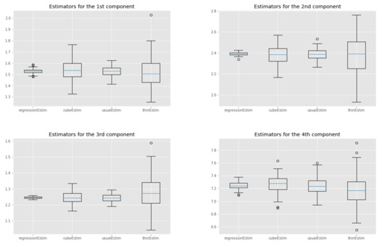 The results are shown in Figure 5. First, we can see that the control variates we chose led to a substantial decrease in the variance of the estimates for regressionEstim compared to usualEstim. Second, the cube estimator performed worse than the regression estimator in terms of variance, but this was expected, as explained in Section 4. More interestingly, if we cannot say that the cube estimator performs better than the usual MCMC estimator in general, we can see that for some components it performed as well or even better, even though the cube estimator used only points while the usual estimator used points. This is largely due to the good choice of the control variates. Finally, the cube estimator outperformed the regular thinning estimator for every component, sometimes significantly.