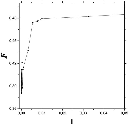 Our data points as entered the Bandt–Pompe technique were obtained as the solutions of Equation (8). From them, we extracted the values of . We pass now to a description of them in terms of Fisher’s measure. For the initial conditions needed, we varied I to obtain our different Fisher values. Figure 1 depicts the results of FIM versus I. We considered 5000 data-points per initial condition and 41 different values of I. Pure classicality is seen at the extreme left, with a relatively low FIM value. FIM oscillations characterize the transition zone. Beyond this zone, an anti-decoherence process of growing FIM leads to the quantum zone on the right side. We see in Figure 1 rapid oscillations near the origin, the zone associated to classical chaos, which was proved to exist in this system in []. After this, the FIM grows, in an steadily ordering process, and then stabilizes itself as the maximum order-degree permitted by quantum uncertainty is reached.