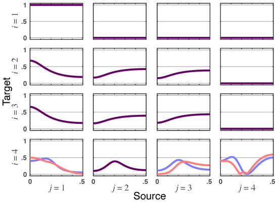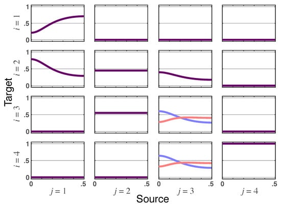 Squared PDC— (blue) and total PDC magnitude— (red) plots, indicated as dark purple lines when traces coincide, from Example 3. Observe that points to a lack of total G-connectivity from to .
