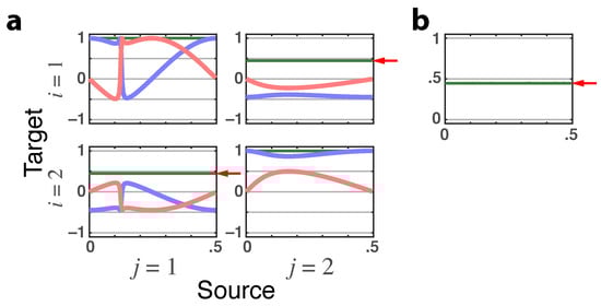 The observed total DTF/PDC are trivially equal to zero for , yet because of iGC as represented by (31), one sees that it manifests itself through a constant that, in turn, leads to a constant magnitude coherence of the same value as indicated by red arrows on Figure 4a,b.