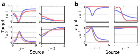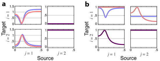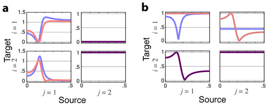 we obtain a total PDC that reflects this change and still detects the lack of feedback (Figure 5a). Furthermore, comparing to in Figure 5b, we see that the unidirectional effect of over is what solely determines the magnitude of the resulting partial coherence.