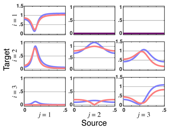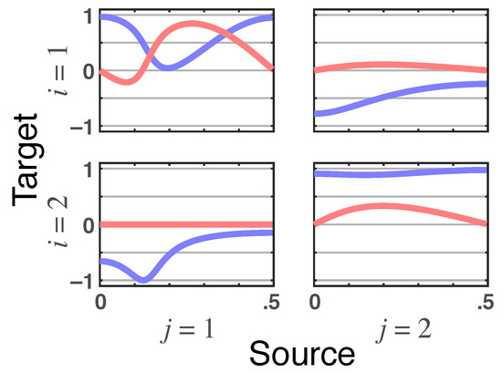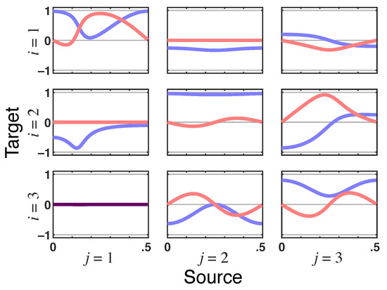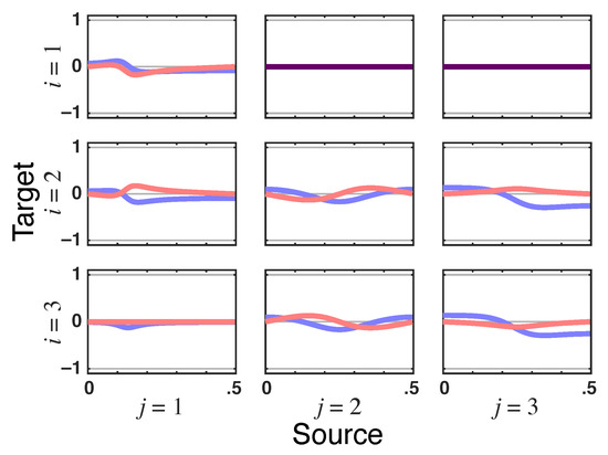 What stands out is that total PDC is identically zero for due to the presence of instantaneous Granger interactions (Figure 10). This nullity is consistent with the structure inferred in [7] when instantaneous quantities are considered by including a zero term lag in (1) (Figure 6.3b in [7]). This happens because —the residual directed PDC from —in (27) is of the opposite sign and instantaneously undoes the effect of iPDC ( as it too has no delay (look at the panel in Figure 11).