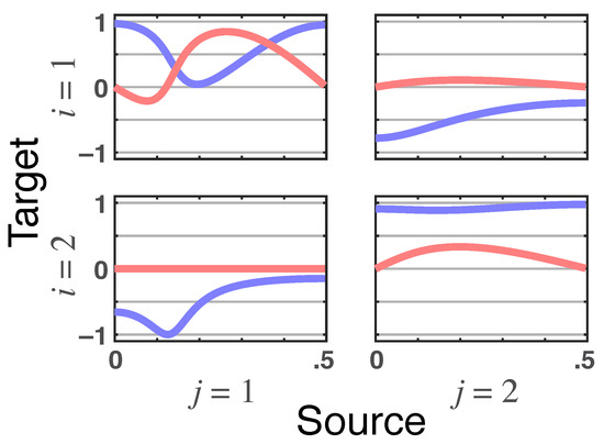 Latent directed instantaneous connectivity—’s real (blue lines) and imaginary (red lines) parts plots for Example 2.3. Note that ’s imaginary part nullity is a signature of their delayless relationship.