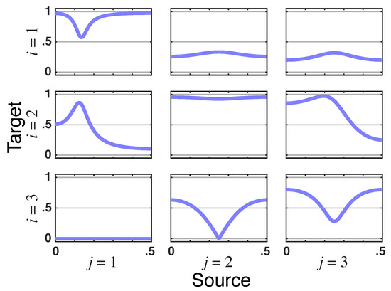 First of all, Equations (9) and (17) confirm the roles of iDTF and iPDC as factors of coherency and partial coherency as we have repeatedly stated [4], where the standard plots for them are organized as graph panels with the same layout, portraying the magnitude squared values of the entries in and , respectively.