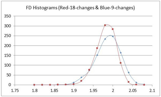 Fractal dimension histograms-18 changes (Blue) and 9 changes (Red) for N = 1000.