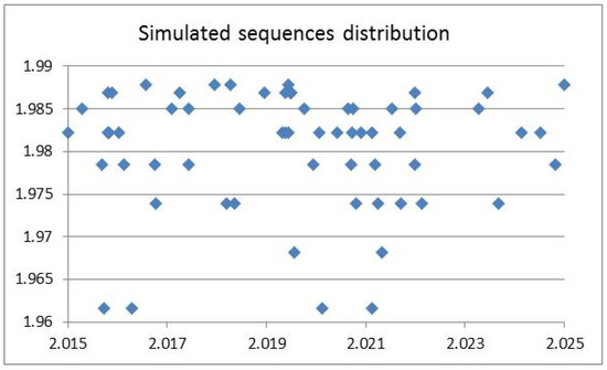 The histogram simulation is sensitive to the number of changes, although there was no correlation of entropy and FD in the sequences generated by the simulation. For instance, in the simulation of 1000 sequences of the 8 T-nucleotide and 10 A-nucleotide changes, there were 63 simulated sequences with FDs between 2.015 and 2.025, with a correlation of 0.004, as shown in Figure 5. Only 4 simulated sequences showed entropy values less than 1.97.