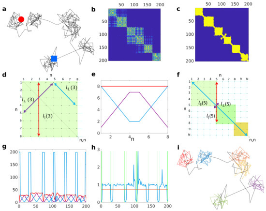 (a). Simulated 2D trajectory alternating between free Brownian motion and reflected diffusion in a disk of radius . Diffusion coefficient is in both cases and duration of states in both cases is a Poisson distributed duration with mean and for free and reflected motions, respectively. Red circle denotes beginning and blue square the end of the trajectory. (b). Matrix M computed from trajectory in (a) with a test lengthscale . (c). Binary matrix B after thresholding M in (b), filling the lacunarities and adding diagonal lines. (d). Illustration of the the block time (red), the neighbouring time (purple), and the persistence time (cyan) computed at the step of an ideal B matrix illustrating a fully trapped trajectory of 8 steps. (e). Illustration of the inequality along the diagonal for a perfect block . (f). Illustration demonstrating that at transition between two blocks, the persistence time becomes as long as the trajectory itself. (g). Computation of (red), (purple), and (cyan) based on (c). (h). Block invariant (blue) computed over time based on (g) against the threshold value ; green rectangles underline misclassified trajectory portions. (i). Classified trajectory, where black represents free portions and different colours represent distinct detected trapped portions.