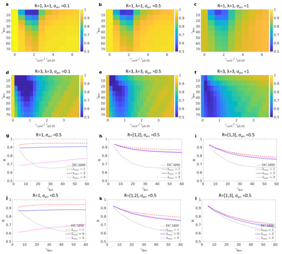 Each panel presents the recognition score for 2D trajectories alternating between free and trapped motions. (a–c) Trapping radius is , and test lengthscale is . Shown are tested combinations of free Brownian motion of mean duration and mean trapping duration ; coordinates are perturbed with white noise of level (a–c). (d–f) and . Each rectangle represents a combination of free Brownian motion of mean duration and mean trapping duration ; coordinates are perturbed with white noise of level . (g–i) Free motion is Brownian motion; noise level was added to trajectories. Trapping radius is in the range , where in (g–i). In each case, test lengthscales from to by increments of are combined where (dashed red, dotted-dashed blue, and dotted magenta). Black line shows the recognition score obtained from DC-MSS algorithm. (j–l) Same as for (g–i) except that the free motion is replaced by subdiffusive fractional Brownian motion with Hölder exponent .