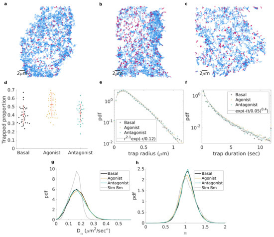 (a–c). All receptor trajectories longer than 50 frames from a single cell in each group; trajectory portions are coloured according to whether they are detected as free (blue) or trapped (red). Cells are, respectively: (a) in basal state, (b) stimulated with agonist, and (c) treatment with neutral antagonist. (d). Proportion of trapped molecules per frame; each point corresponds to a cell for basal (black), agonist stimulated (yellow), and neutral antagonist treated (green). (e,f). Empirical probability density function for basal (black), agonist stimulated (yellow), and neutral antagonist treated (green) of (e) trap radius and (f) trapping duration. Grey lines denote fitting with Gamma distribution (e) and stretched exponential (f). (g,h). Empirical probability density estimated for free trajectory portions longer than 50 frames of (g) the anomalous diffusion exponent and (h) the corresponding generalized diffusion coefficient .
